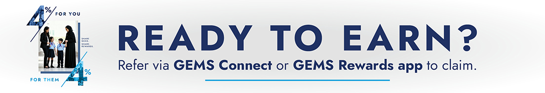 For a limited time, every successful referral to any of the participating GEMS schools will earn 4% of the referred child’s annual tuition in GEMS Points and the referred family also earns 4%.